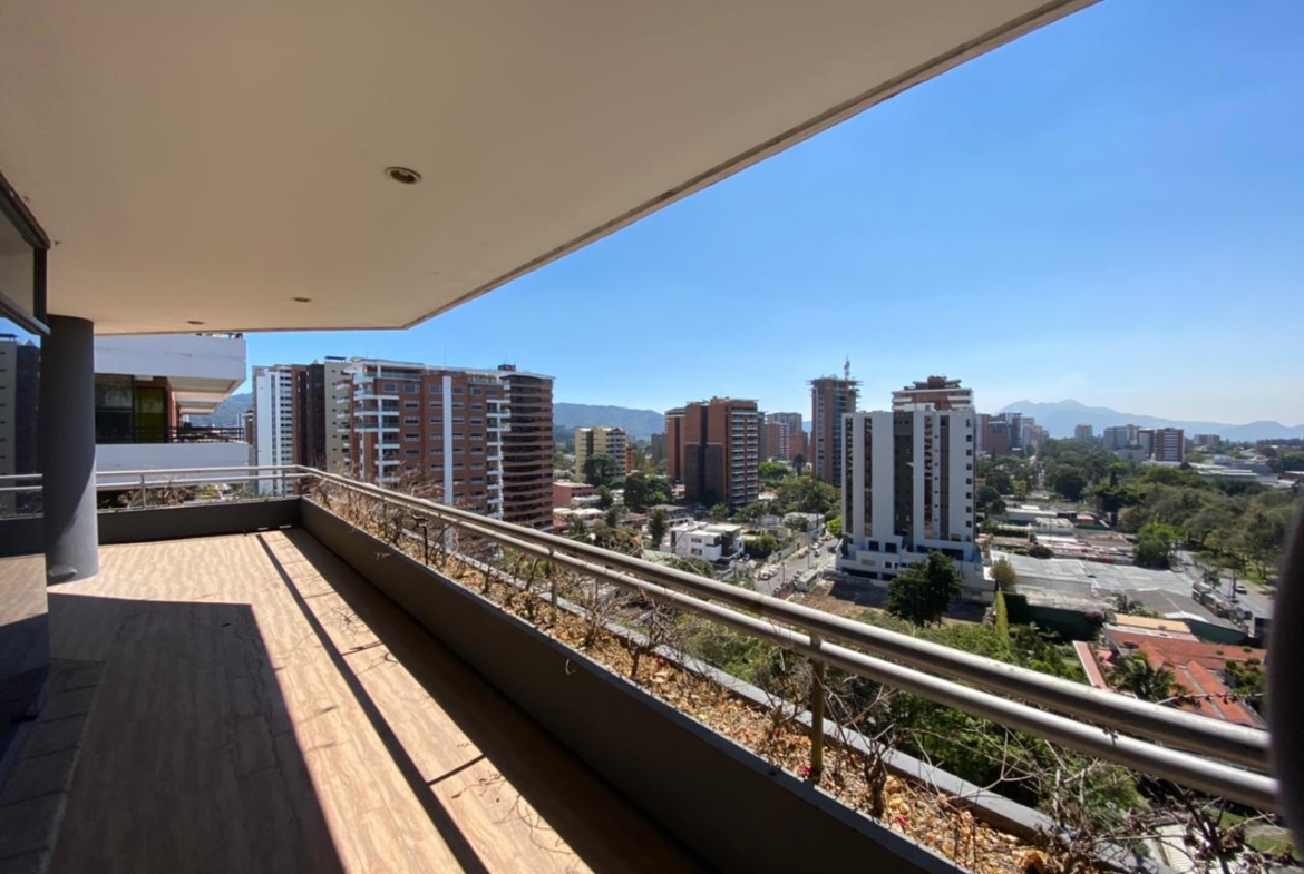 Sala y Comedor con salida a amplio balcón con vista ininterrumpida a los volcanes, pista de aterrizaje del Aeropuerto La Aurora y Avenida de Las Américas.